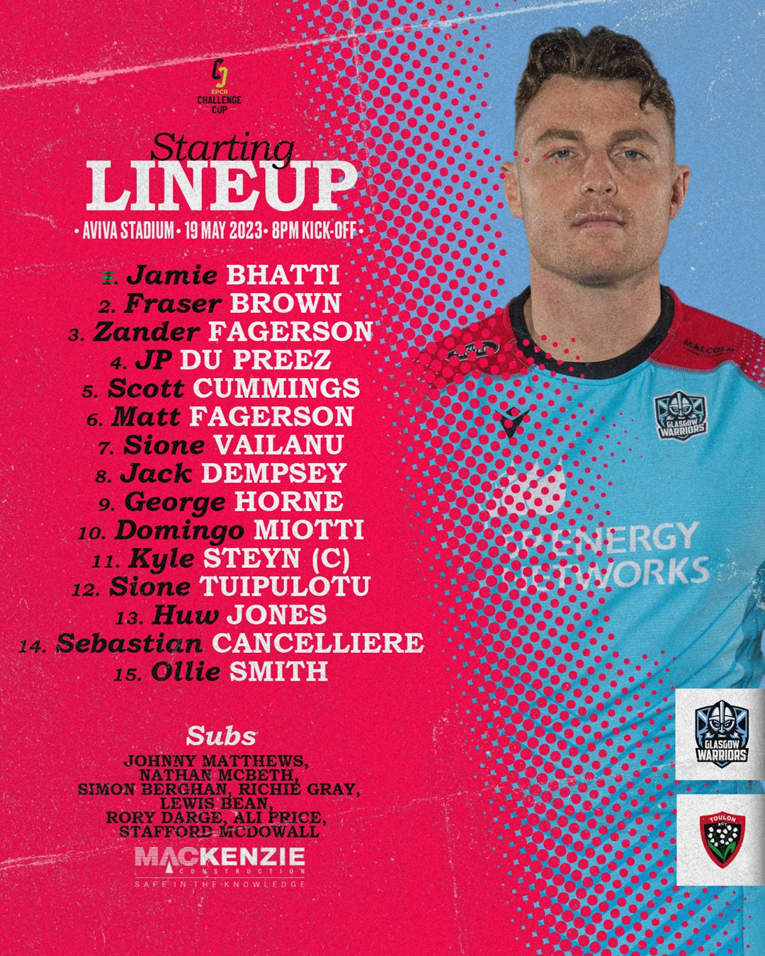 Triplă campioană a Europei în urmă cu un deceniu, RC Toulon (Franța) va înfrunta pe Glasgow Warriors (Scoția), astăzi (vineri, 19 mai 2023), la ora 22.00, în finala ediției 2022/2023 a Challenge European Cup, a doua competiție ca valoare de pe continent. Confruntarea se dispută la Dublin, pe Stadionul Aviva, și va fi transmisă și în România pe Digi Sport 3.