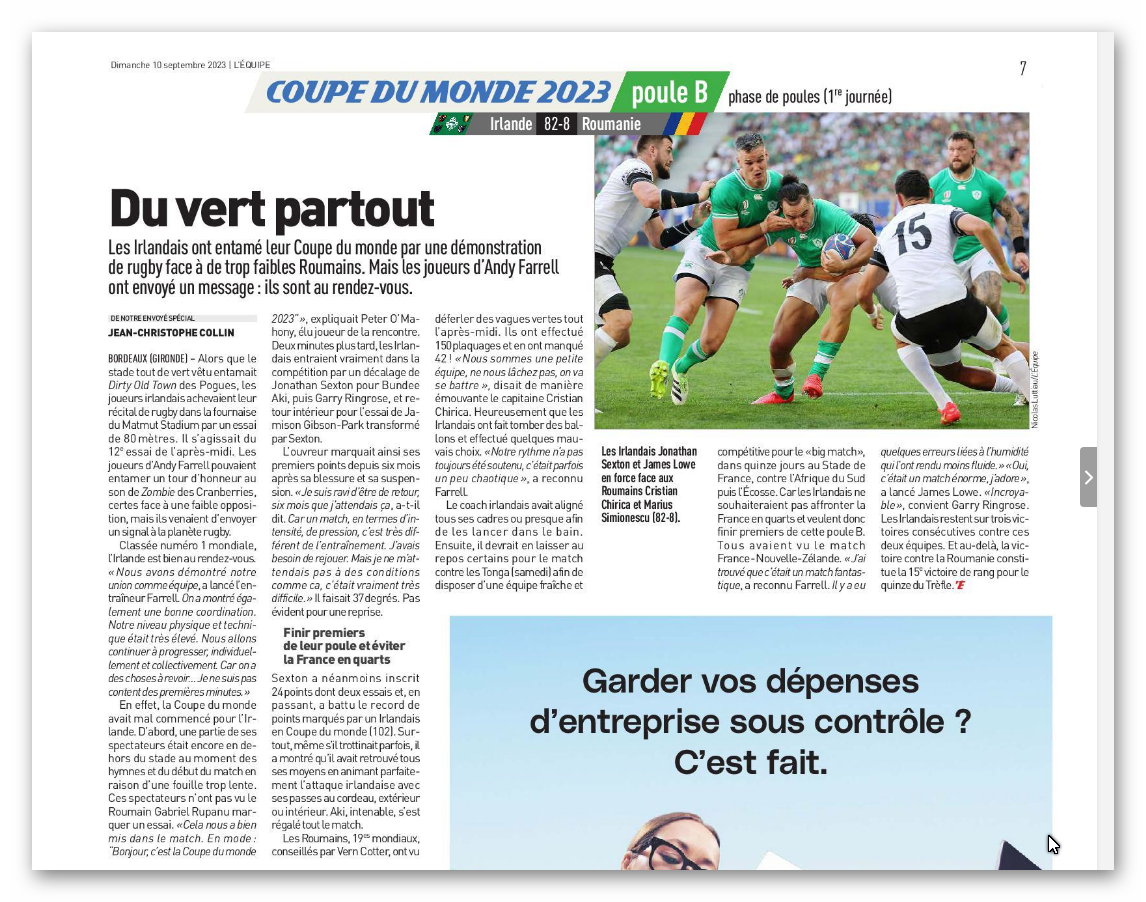 CUPA MONDIALĂ 2023 / IRL - ROM 82-8 / REVISTA PRESEI: „Irlanda a zdrobit România”, a titrat „L''Equipe”