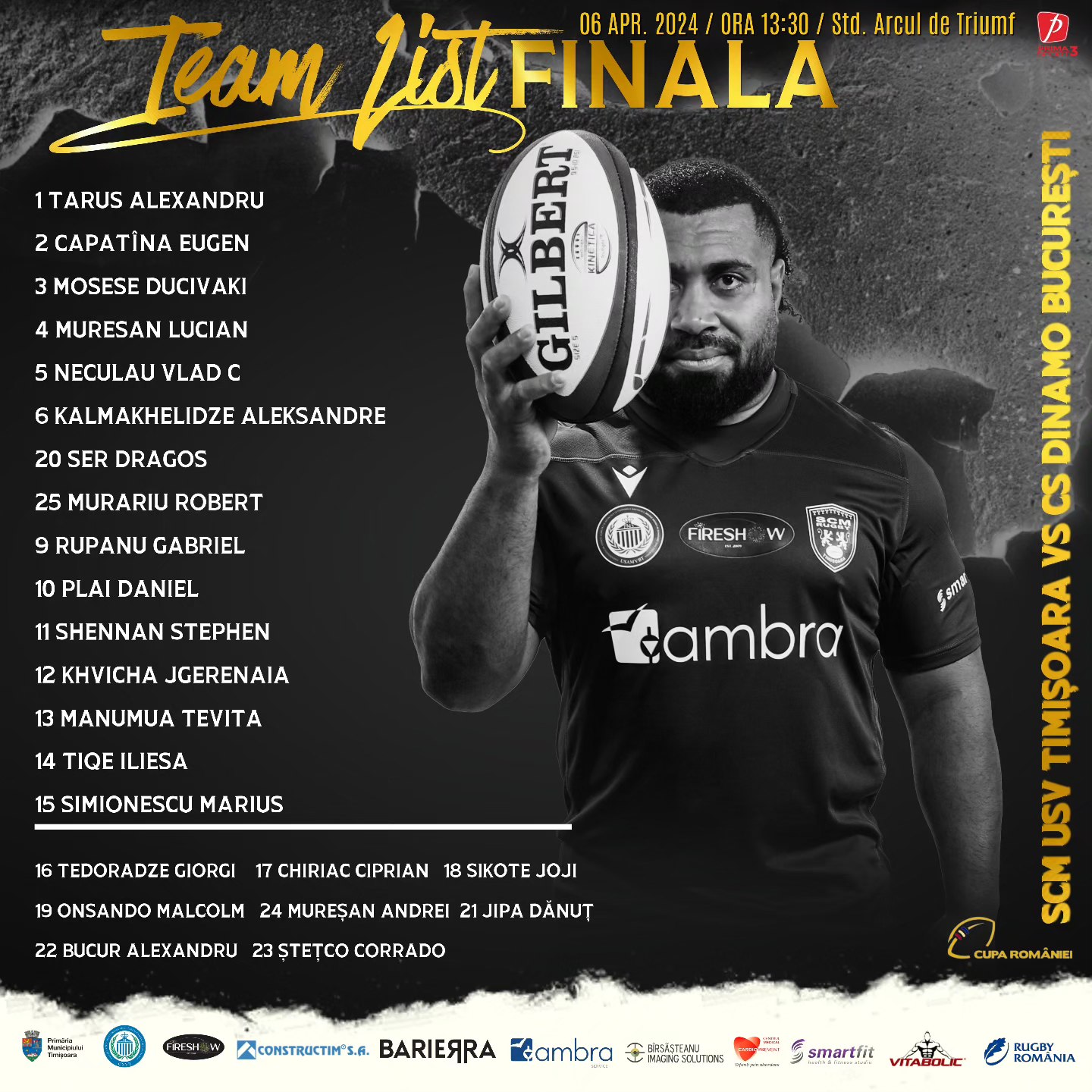 SCM USV Timișoara: 15. Marius Simionescu - 14. Iliesa Tiqe, 13. Tevita Manumua, 12. Jgerenaia Khvicha, 11. Stephen Shennan - (md) 10. Daniel Plai, (mg) 9. Gabriel Rupanu - 20. Dragoș Ser, 25. Robert Murariu, 6. Aleksandre Kalmakhelidze - 5. Vlad Neculau (cpt.), 4. Ionuț Mureșan - 3. Mosese Digo, 2. Marian Căpățână, 1. Alexandru Țăruș