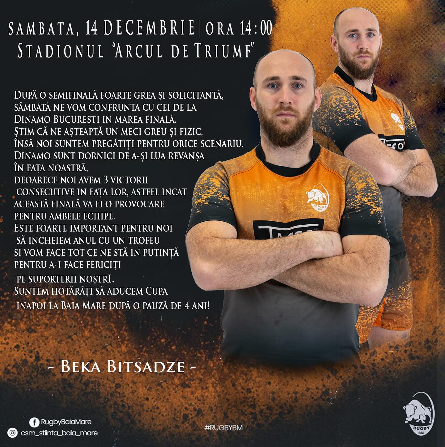 Component al echipei maramureșene, georgianul Beka Bitsadze (33 de ani) s-a referit la finala cu Dinamo: „După o semifinală foarte grea și solicitantă, sâmbătă vom înfrunta pe Dinamo București în marea finală. Știm că va fi un joc dur și fizic, dar suntem pregătiți pentru orice scenariu. Dinamo vrea să se revanșeze, deoarece avem 3 victorii la rând în fața lor. Așa că această finală va fi o provocare pentru ambele echipe. Este foarte important pentru noi să încheiem anul cu un trofeu și vom face tot posibilul ca suporterii noștri să fie fericiți și mândri. Suntem hotărâți să aducem Cupa înapoi la Baia Mare după o pauză de 4 ani!”.