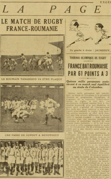 Nota autorului: Inițial, pentru mulți ani, și eu am dat ca rezultat al meciului Franța - România 59-3. Fiindcă mi s-a părut ciudat ca în timp ce francezii spun că a fost 59-3 noi, românii, să susținem că 61-3 este corect... Mai apoi, însă, consultând și documentele CIO, inclusiv Raportul Oficial al Jocurilor Olimpice Paris 1924, precum și ziarele străine, dar și bucureștene am constatat că și în acestea apare 61-3. Ceea ce mă face să adopt această variantă.
