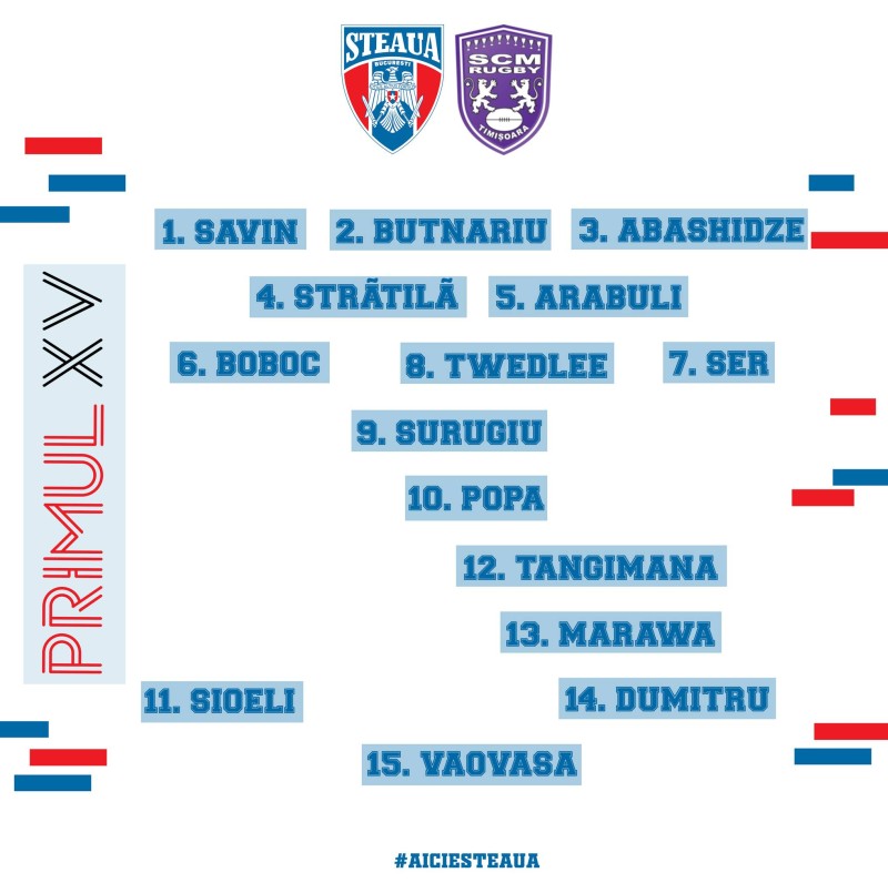 SCM USV Timișoara: 15. Marius Simionescu - 14. Iliesa Tiqe, 13. Tevita Manumua, 12. Jgerenaia Khvicha, 11. Stephen Shennan (cpt.) - (md) 10. Dănuț Jipa, (mg) 9. Gabriel Rupanu - 7. Vlad Neculau (cpt.), 6. Robert Murariu, 24. Kemal Altinok - 5. Ionuț Mureșan, 4. Malcolm Onsando - 3. Mosese Digo, 2. Marian Căpățînă, 1. Ciprian Chiriac
