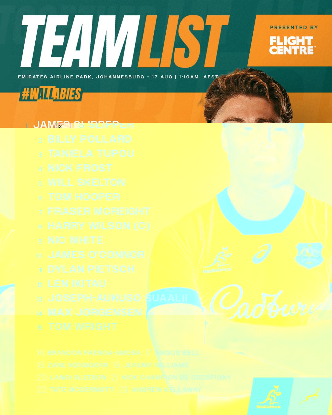 Rezerve: 16. Paenga-Amosa, 17. Bell, 18. Nonggorr, 19. Williams, 20. Gleeson, 21. Champion De Crespigny, 22. McDermott, 23. Kellaway