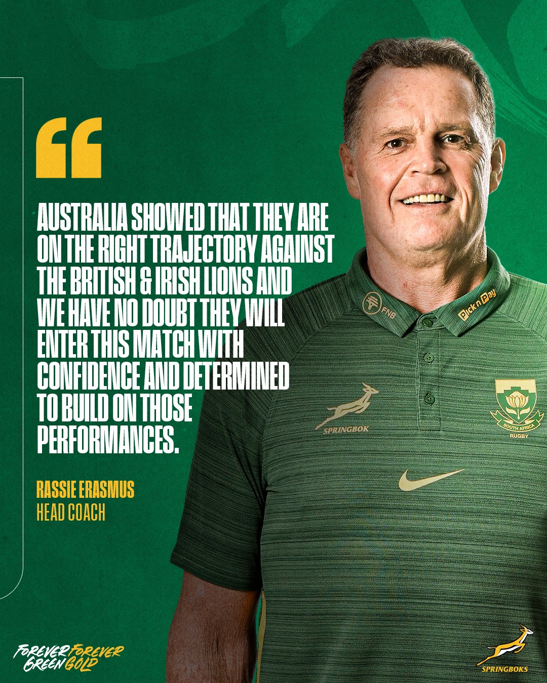 Antrenor al echipei Springbok, Rassie Erasmus l-a ales pe căpitanul său, Siya Kolisi, să îmbrace tricoul cu numărul 8, ceea ce se va întâmpla pentru prima dată. Acesta va disputa meciul cu numărul 94 pentru Springboks, iar până acum a acționat ca flanker. Trebuie spus, însă, că a jucat o bună parte a sezonului pe această poziție pentru selecționata Sharks, și că titularul obișnuit pe această poziție, Jasper Wiese, este suspendat. Siya Kolisi va fi flancat de Marco van Staden și Pieter-Steph du Toit.