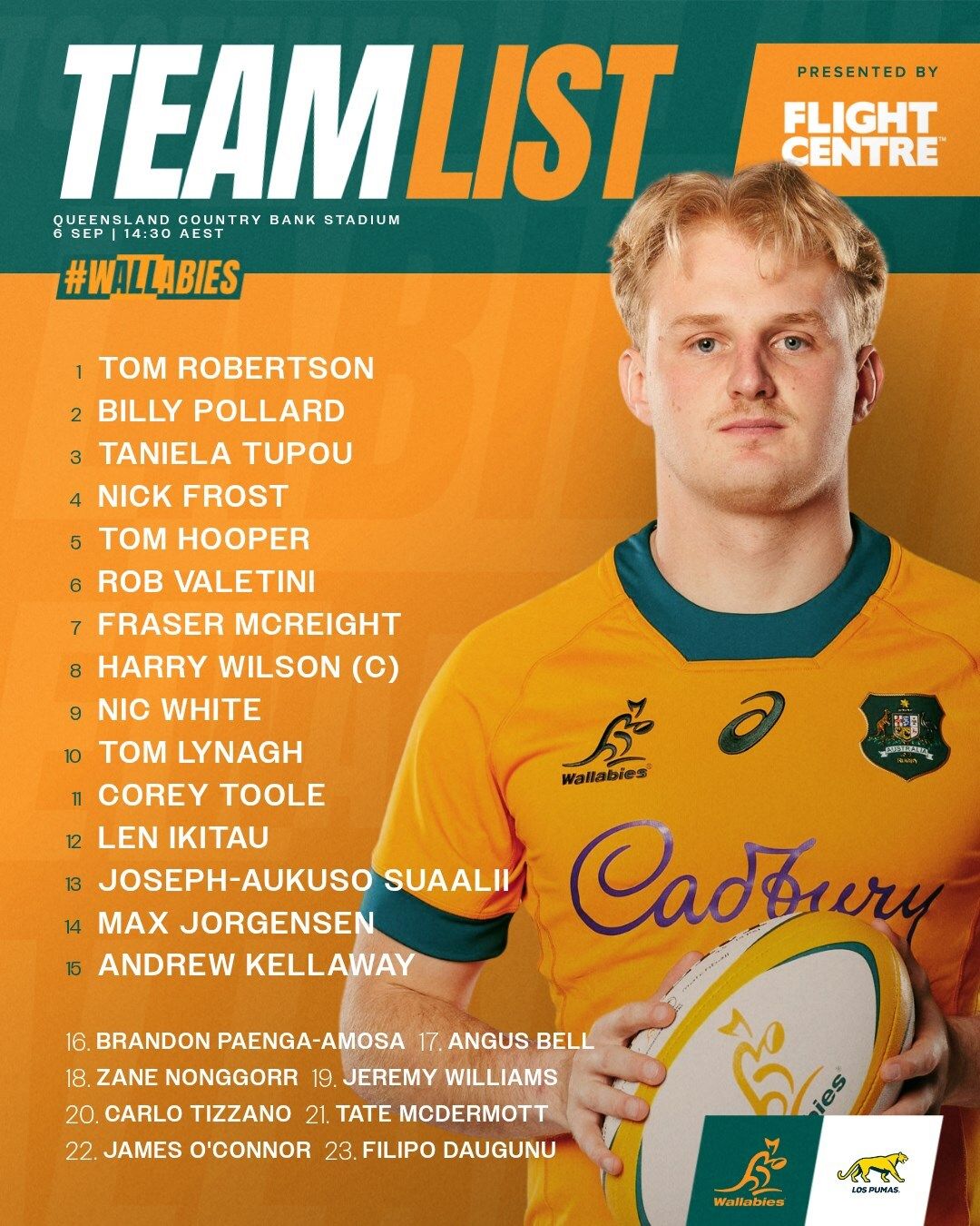 XV-le de start: 15. Kellaway - 14. Jorgensen, 13. Suaalii, 12. Ikitau, 11. Toole - (md) 10. Lynagh, (mg) 9. White - 7. McReight, 8. Wilson (cpt.), 6. Valetini - 5. Hooper, 4. Frost - 3. Tupou, 2. Pollard, 1. Robertson.
