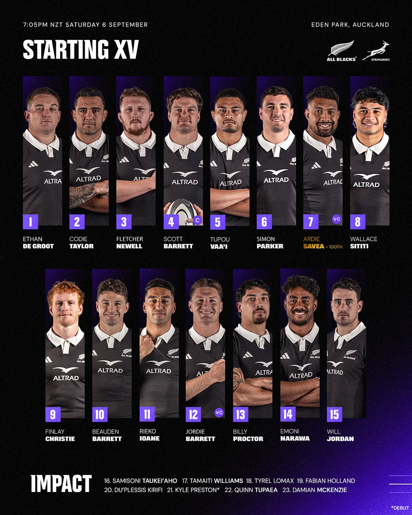 XV-le de start: 15. Jordan - 14. Narawa, 13. Proctor, 12. J. Barrett, 11. R. Ioane - (md) 10. B. Barrett, (mg) 9. Christie (m) - 7. Sititi, 8. Savea, 6. Parker - 5. Vaa'i, 4. S. Barrett - 3. Newell, 2. Taylor, 1. de Groot.