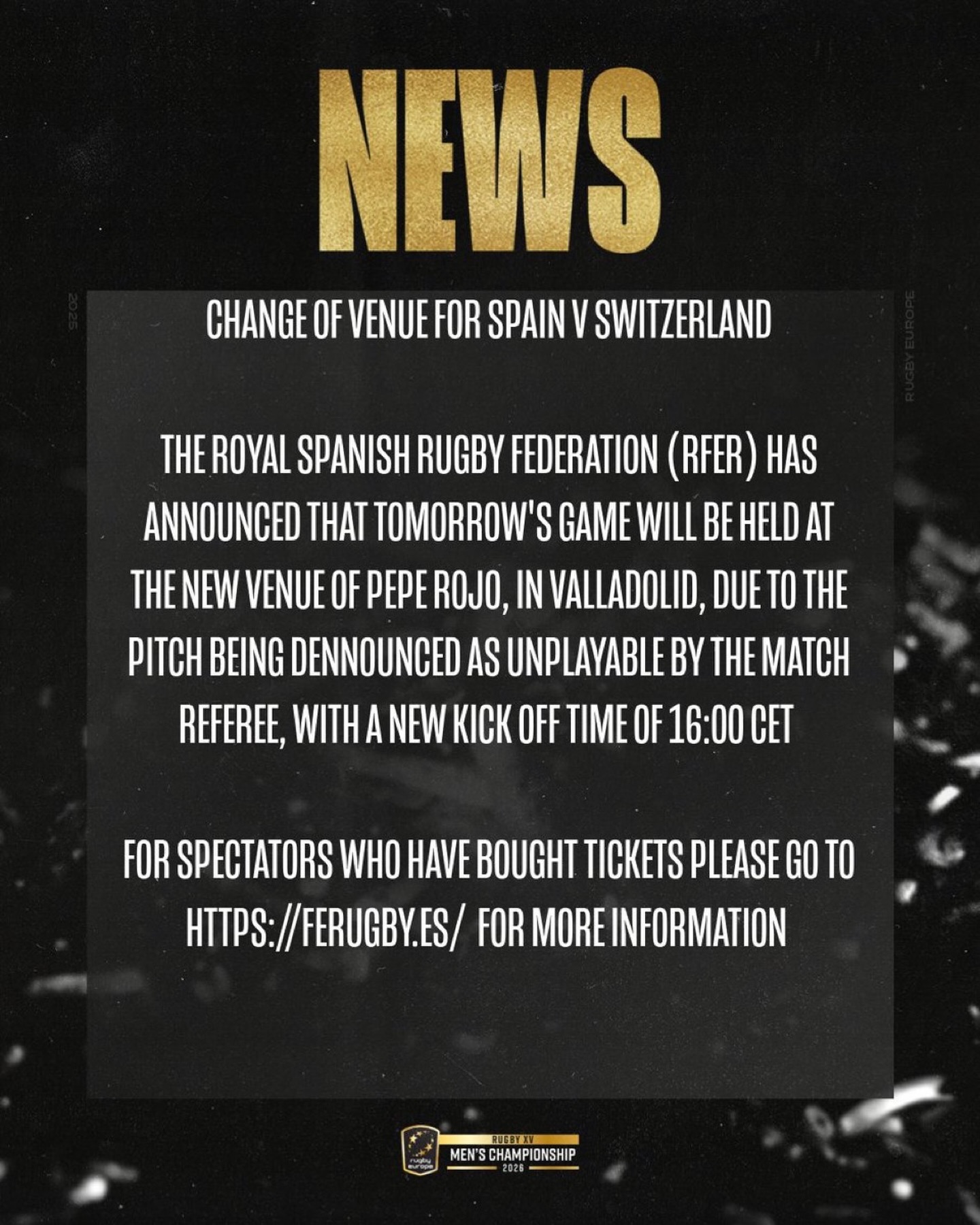 Așadar, după cum se observă, meciurile nu se suprapuneau. Doar că în 13 februarie a.c., adică vineri, Rugby Europe a făcut următorul anunț: „Federația Spaniolă de Rugby a anunțat că meciul de mâine se va derula pe stadionul Pepe Rojo din Valladolid, terenul inițial fiind declarat impracticabil de arbitru. Lovitura de începere se va da la ora 16.00 CET (n.red - Ora Europei Centrale, adică 17.00 pe teritoriul României)”.