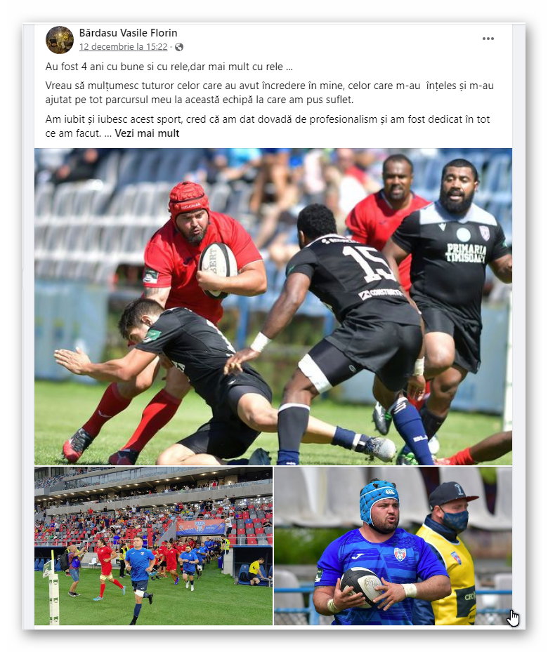Clasarea pe locul 4 a echipei de rugby n-a căzut deloc bine la CSA Steaua București. Cu 24 de titluri de campioană, gruparea militară este cea mai galonată din sportul cu balonul oval de la noi. Problema este, însă, că de 17 ani aceasta n-a mai obținut niciun succes în competiția internă, fiind învinsă în 8 finale de Dinamo, Baia Mare și Timișoara. Și în ediția 2023, Steaua a debutat bine, impunându-se pe terenul din Baia Mare. Pe final, s-a repetat povestea din ultimii ani. În sensul că Steaua a pierdut atât semifinala cu Dinamo (19-20), cât și meciul pentru locul 3 cu Timișoara (8-26). La puțin timp după acest eșec, jucătorul de linia I Florin Bărdașu a postat un mesaj pe rețelele sociale în care și-a anunțat plecarea de la Steaua. (Foto facsimil: Florin Bărdașu / Facebook)