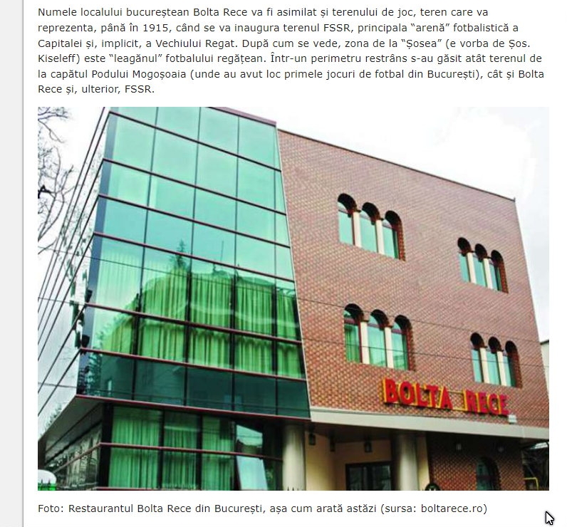 În site-ul Ripensia Sport Magazin, unul realizat de cunoscutul ziarist timișorean Octavian Stăncioiu, apare o pagină cu titlul: Bolta Rece, „leagănul” fotbalistic al Vechiului Regat. Iată ce scrie autorul: „Numele localului bucureștean Bolta Rece va fi asimilat şi terenului de joc, teren care va reprezenta, până în 1915, când se va inaugura terenul FSSR, principala “arenă” fotbalistică a Capitalei şi, implicit, a Vechiului Regat. După cum se vede, zona de la “Şosea” (e vorba de Şos. Kiseleff) este “leagănul” fotbalului regăţean. Într-un perimetru restrâns s-au găsit atât terenul de la capătul Podului Mogoşoaia (unde au avut loc primele jocuri de fotbal din Bucureşti), cât şi Bolta Rece şi, ulterior, FSSR”. (Articolul integral poate să fie citit la linkul: https://www.ripensia-sport-magazin.ro/istoria-fotbalului/bolta-rece-leaganul-fotbalistic-al-vechiului-regat/)