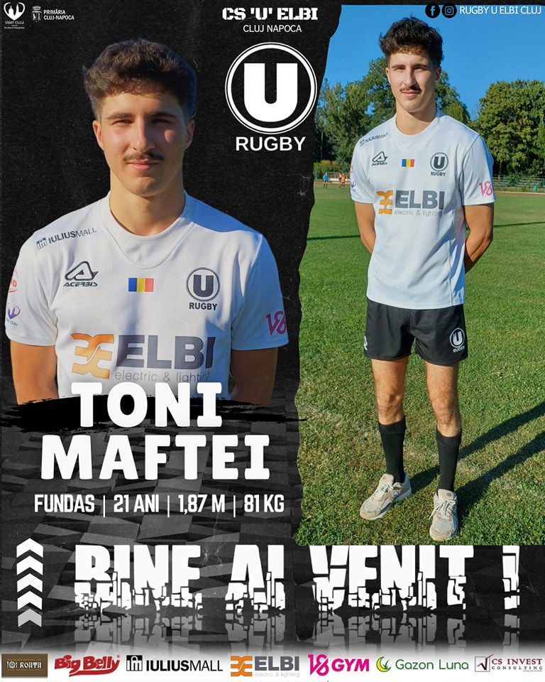 Se știe că în rugby există numeroase exemple de copii care au călcat pe urmele părinților. În aceeași situație este și Toni Sebastian Maftei (21 de ani), care a fost anunțat oficial în lotul formației CS „U” Elbi Cluj. Acesta este fiul fostului internațional Valentin Maftei, care a evoluat pentru gruparea transilvană în anii 90, înainte de a face carieră în Franța. Toni s-a format ca rugbyst la Aurillac, participând cu echipa României la Campionatul European U18 din 2021, iar apoi a fost convocat și în reprezentativa de rugby în 7. Maftei junior evoluează ca fundaș, postul pe care s-a remarcat și tatăl său. (Foto: CS „U” Elbi Cluj)