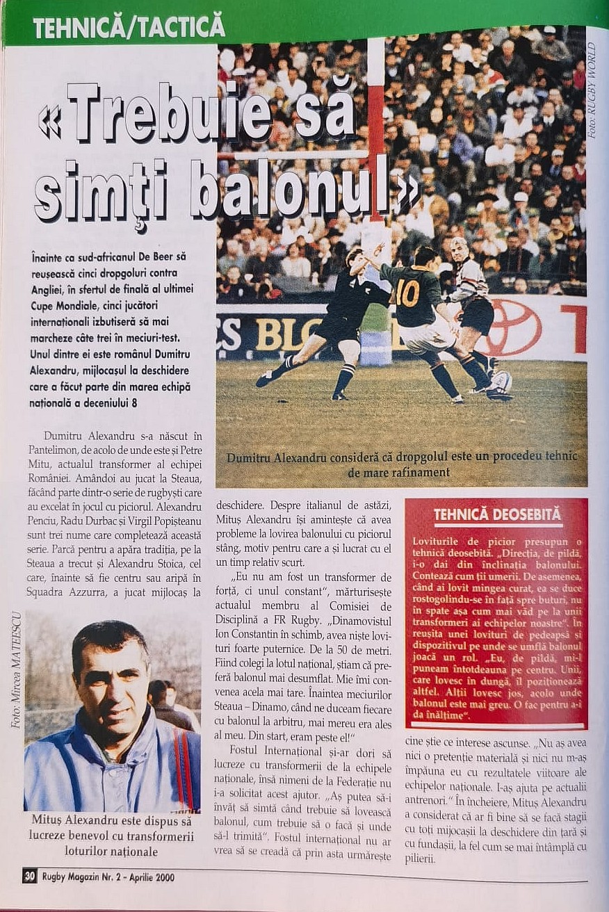Un mare specialist al dropgolului a fost Alexandru Penciu, cel supranumit de galezi „Alexandru cel Mare”. De asemenea, executant al dropgolului a fost și Dumitru „Mituș” Alexandru, component al echipei României din anii 80. Acesta mi-a vorbit pentru revista „Rugby Magazin” din aprilie 2000 despre tehnica executării loviturilor cu piciorul: „Direcția, de pildă, i-o dai din înclinația balonului. Contează cum ții umerii. De asemenea, când ai lovit mingea curat, ea se duce rostogolindu-se în față spre buturi, nu în spate așa cum mai văd pe la unii transformeri ai echipelor noastre”. Tot atunci, fostul mijlocaș la deschidere al Stelei îmi spunea că a lucrat puțin și cu Alexandru Cristian Stoica, pe vremea când cel care a devenit mai apoi căpitan al Italiei a activat la grupele de copii din Ghencea. Și a subliniat că nu a fost „un transformer de forță, ci unul constant. Dinamovistul Ion Constantin, în schimb, avea niște lovituri foarte puternice. De la 50 de metri. Fiind colegi la lotul național, știam că preferă balonul mai desumflat. Mie îmi convenea acela mai tare. Înaintea meciurilor Steaua - Dinamo, când ne duceam fiecare cu balonul la arbitru, mai mereu era ales al meu. Din start, eram peste el”.