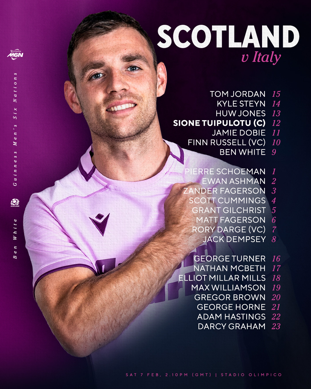 Pe de altă, se remarcă revenirea în linia de treisferturi a lui Huw Jones (58 de selecții, 23 de eseuri), pe postul de centru, și a pilierului Zander Fagerson (76 de selecții, 3 eseuri), care s-au refăcut după accidentări suferite anul trecut.