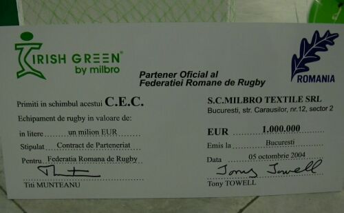 Compania romano-irlandeza Milbro a semnat un parteneriat cu Federatia Romana de Rugby, in valoare de un milion de euro, devenind astfel unul dintre cei mai importanti parteneri ai rugbyului romanesc. Practic, de acum incolo toate echipele nationale ale Romaniei vor fi imbracate cu echipamentul produs de Milbro, purtand logo-ul Irish Green, marca recunoscuta in toata lumea. “Acest parteneriat aduce pentru FRR un milion de euro, o suma foarte importanta, dar si un partener ca Milbro, o firma cu nume de acum din randul textilelor, ceea ce inseamna, practic, o recunoastere a saltului facut de FRR in ultima vreme”, ne-a marturisit Octavian Morariu, presedintele FRR.